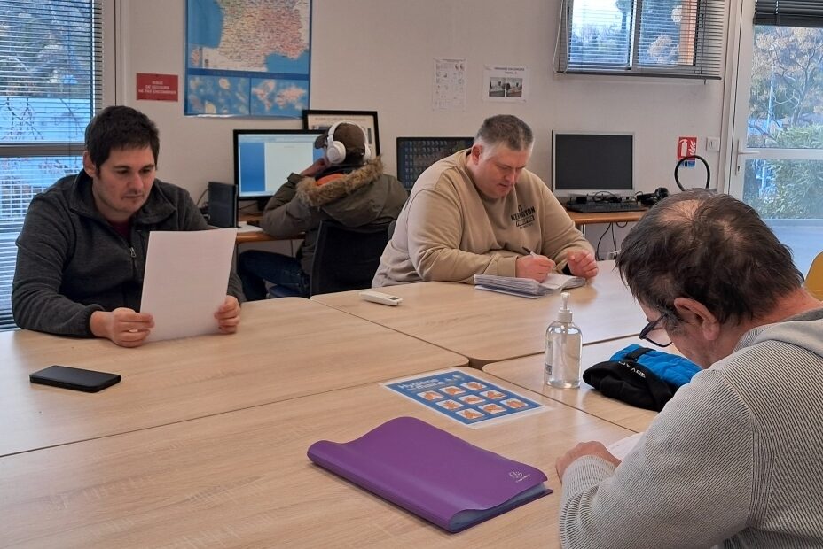 Il y a une personne qui dicte les ordres du jour à deux autres qui écrivent sur leurs cahiers. Les deux écrivains se divisent le travail en 2, chacun écrit une partie des ordres du jour. Ensuite, ils donnent leur cahier à un autre résident qui, lui, le tape sur l’ordinateur au propre et fait la mise en page et un autre résident cherche les images et les imprime. L’éducatrice vérifie l’orthographe et la syntaxe. Puis elle imprime les ordres du jour pour qu’on puisse les coller dans notre cahier et on met les images dans l’ordre en fonction de l’ordre du jour et ensuite parfois on s’entraine à lire.